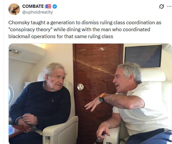 The image of Chomsky alongside Jeffrey Epstein is revealing, not incidental. It captures a career defined by proximity to power without consequence. Unlike genuine anti-imperialists who collided with the state—the Black Panthers, Weather Underground, or figures such as Hugo Chávez, Fidel Castro, Che Guevara, Philip Agee, or Patrice Lumumba—Chomsky was never arrested, disappeared, exiled, or neutralized. That absence is not a mystery; it is the point. Empire does not protect its enemies. It protects those who help manage dissent. Chomsky represents a class of elite intellectuals whose weapon is not resistance but confusion—dense diction, endless qualification, and moral posturing that drain urgency while never threatening power.