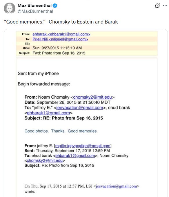 The images shown below speak more eloquently than I ever could about how deeply Chomsky was sucked into Jeffrey Epstein’s world. Are US elites happy to see Chomsky disgraced? The kinds of liberal spooks who cultivate a compatible left are probably not happy.